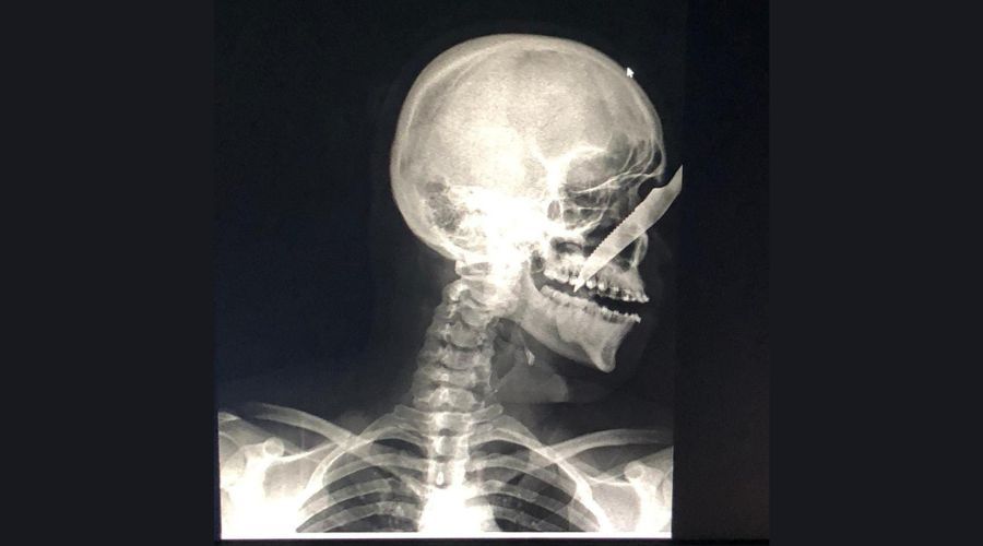 Imagem do raio-X de Alberto mostra a faca alojada no rosto do jovem. O autor da facada foi identificado como André Luís Benevides Carvalho, de 35 anos, que estava bêbado quando fez o ato. André chegou a ser linchado por populares.